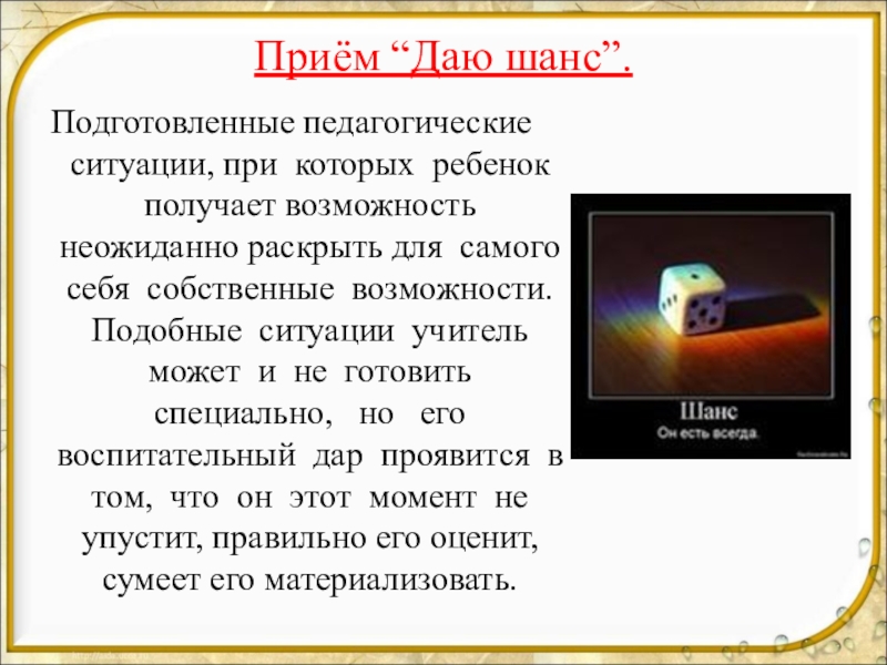 возможность неожиданно раскрыть для самого себя собственные возможности. Подобные ситуации учитель может и не готовить специально, но его воспитательный дар проявится в том, что он этот момент не упустит, правильно его оценит, сумеет его материализовать.