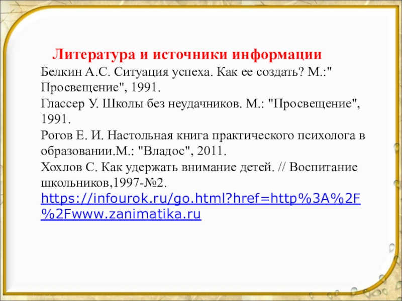 Хохлов С. Как удержать внимание детей. // Воспитание школьников,1997-№2. https://infourok.ru/go.html?href=http%3A%2F%2Fwww.zanimatika.ru