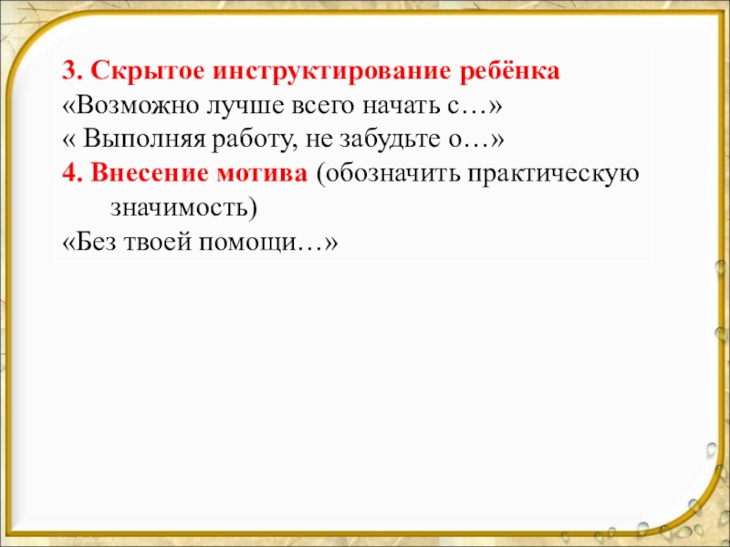 Авансирование. Учитель заранее предупреждает школьника о самостоятельной или контрольной работе, о предстоящей проверке знаний: что должен будет ребенок сделать (повторить, перечитать, перерешать). Чем-то это напоминает репетицию предстоящего действия.