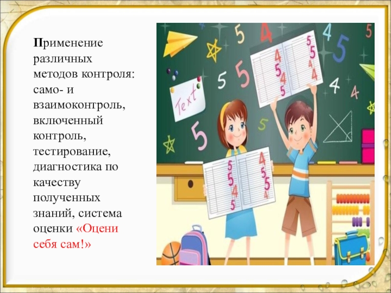 Слайд 15Применение различных методов контроля: само- и взаимоконтроль, включенный контроль, тестирование, диагностика