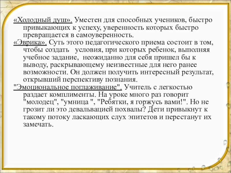Слайд 28«Холодный душ». Уместен для способных учеников, быстро привыкающих к успеху, уверенность