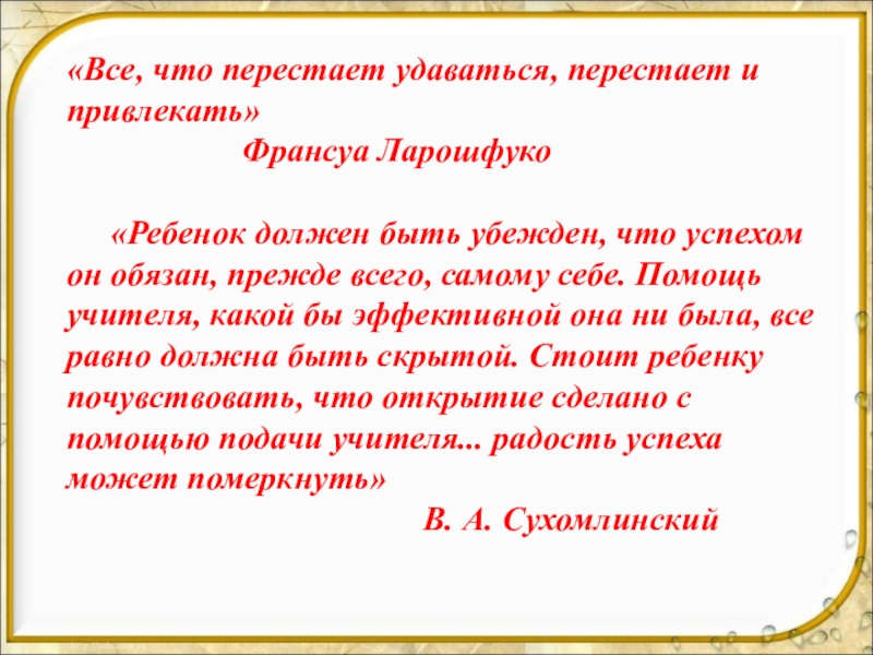 «Ребенок должен быть убежден, что успехом он обязан, прежде всего, самому себе. Помощь учителя, какой бы эффективной она ни была, все равно должна быть скрытой. Стоит ребенку почувствовать, что открытие сделано с помощью подачи учителя... радость успеха может померкнуть»