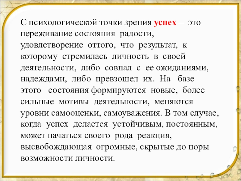 оттого, что результат, к которому стремилась личность в своей деятельности, либо совпал с ее ожиданиями, надеждами, либо превзошел их. На базе этого состояния формируются новые, более сильные мотивы деятельности, меняются уровни самооценки, самоуважения. В том случае, когда успех делается устойчивым, постоянным, может начаться своего рода реакция, высвобождающая огромные, скрытые до поры возможности личности.