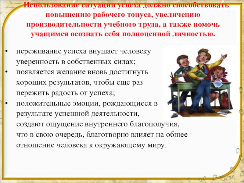 Слайд 34 Использование ситуации успеха должно способствовать повышению рабочего тонуса, увеличению