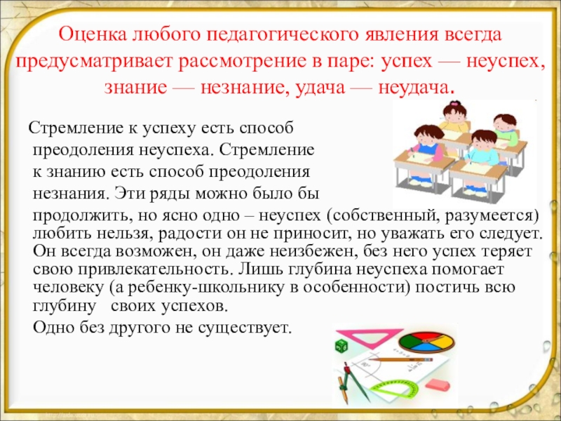 Слайд 36Оценка любого педагогического явления всегда предусматривает рассмотрение в паре: успех —