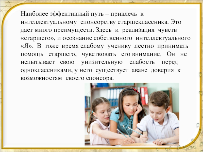много преимуществ. Здесь и реализация чувств «старшего», и осознание собственного интеллектуального «Я». В тоже время слабому ученику лестно принимать помощь старшего, чувствовать его внимание. Он не испытывает свою унизительную слабость перед одноклассниками, у него существует аванс доверия к возможностям своего спонсора.