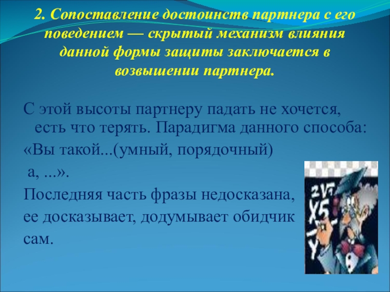 Слайд 112. Сопоставление достоинств партнера с его поведением — скрытый механизм влияния данной формы