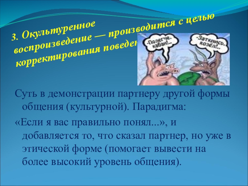 «Если я вас правильно понял...», и добавляется то, что сказал партнер, но уже в этической форме (помогает вывести на более высокий уровень общения).