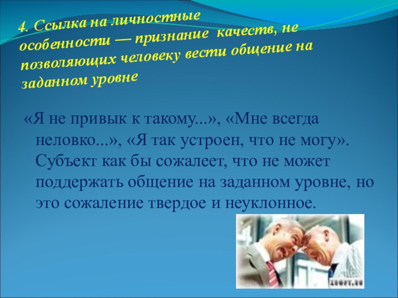 Слайд 64. Ссылка на личностные особенности — признание качеств, не позволяющих человеку вести общение
