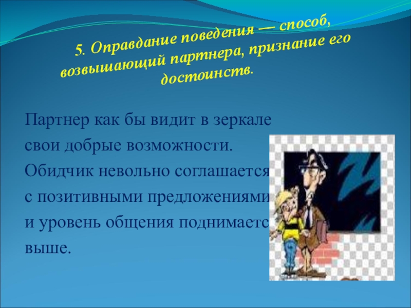 Слайд 75. Оправдание поведения — способ, возвышающий партнера, признание его достоинств.