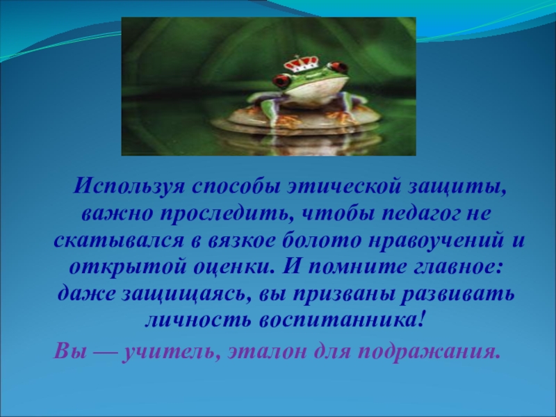 этической защиты, важно проследить, чтобы педагог не скатывался в вязкое болото нравоучений и открытой оценки. И помните главное: даже защищаясь, вы призваны развивать личность воспитанника!