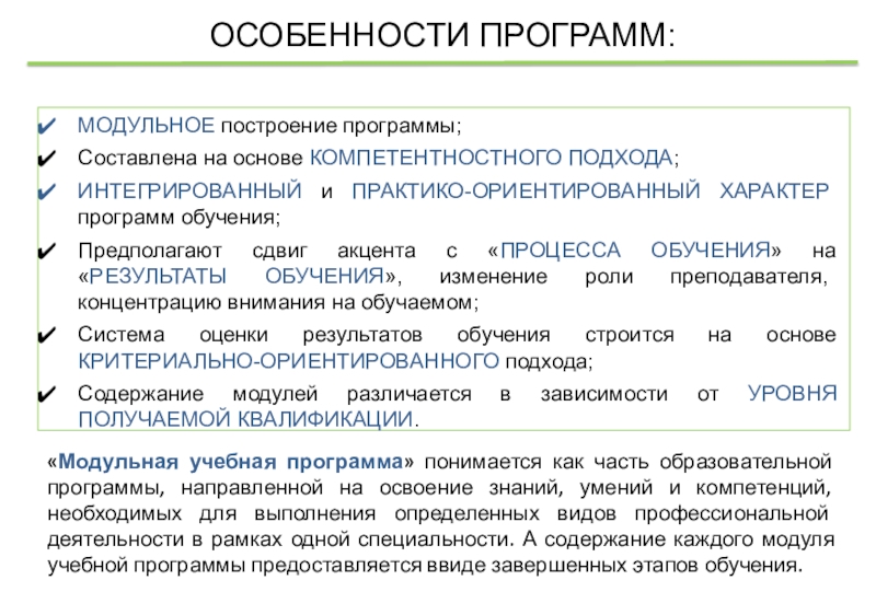 «Модульная учебная программа» понимается как часть образовательной программы, направленной на освоение знаний, умений и компетенций, необходимых для выполнения определенных видов профессиональной деятельности в рамках одной специальности. А содержание каждого модуля учебной программы предоставляется ввиде завершенных этапов обучения.