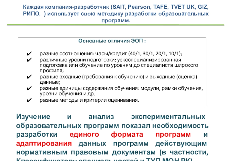 Каждая компания-разработчик (SAIT, Pearson, TAFE, TVET UK, GIZ, РИПО, ) использует свою методику разработки образовательных программ.