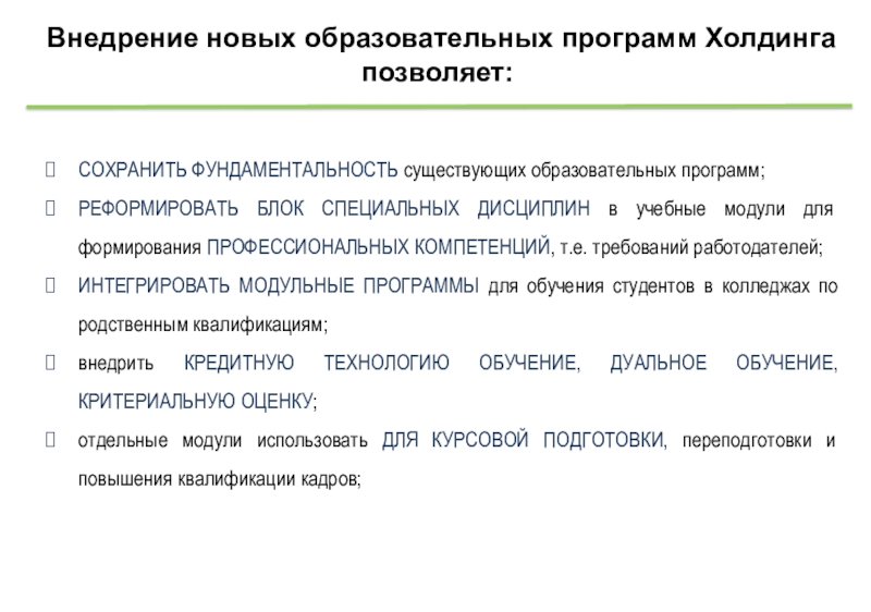 разработка и внедрение рабочей учебно-программной документации по выбранным специальностям на основе новых образовательных программ Холдинга;