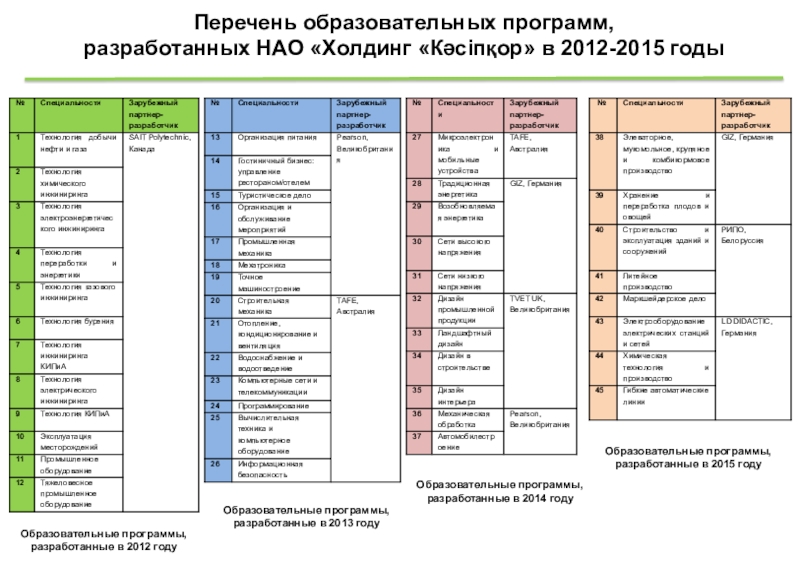 Из 37 программ, разработанных в 2012-2014 годах – 8 колледжей по 5 специальностям;