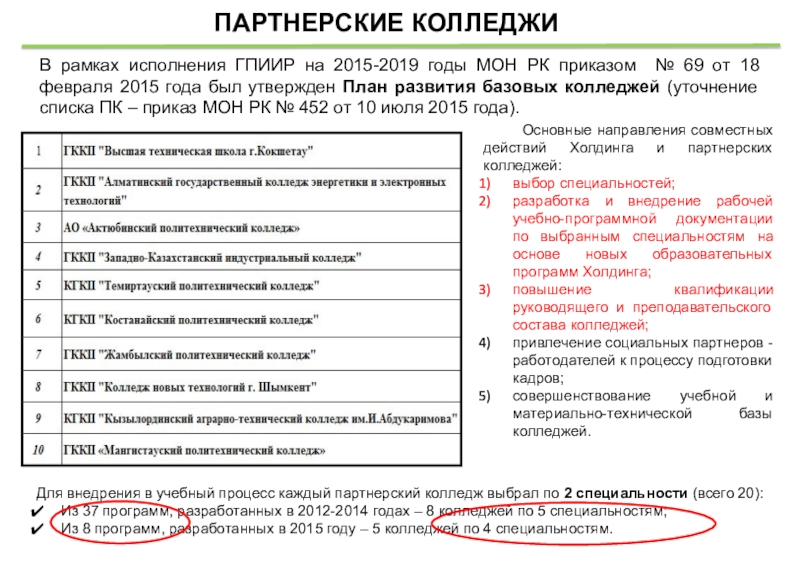Основные направления совместных действий Холдинга и партнерских колледжей: