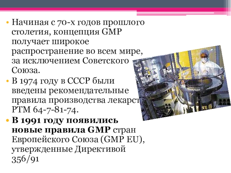 Слайд 4Начиная с 70-х годов прошлого столетия, концепция GMP получает широкое распространение