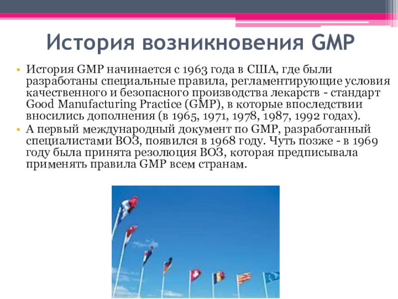 История возникновения GMPИстория GMP начинается с 1963 года в США, где были разработаны специальные правила, регламентирующие условия