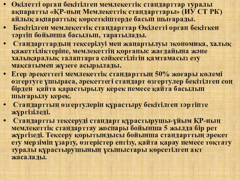 Слайд 10Өкілетті орган бекітілген мемлекеттік стандарттар туралы ақпаратты «ҚР-ның Мемлекеттік стандарттары» (ИУ