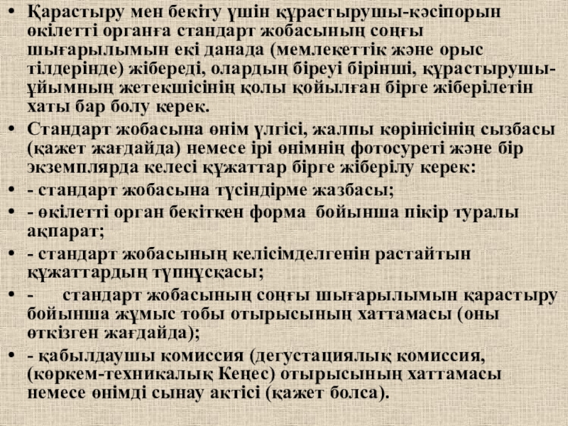 Слайд 8Қарастыру мен бекіту үшін құрастырушы-кәсіпорын өкілетті органға стандарт жобасының соңғы шығарылымын