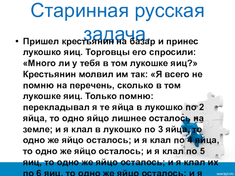 его спросили: «Много ли у тебя в том лукошке яиц?» Крестьянин молвил им так: «Я всего не помню на перечень, сколько в том лукошке яиц. Только помню: перекладывал я те яйца в лукошко по 2 яйца, то одно яйцо лишнее осталось на земле; и я клал в лукошко по 3 яйца, то одно же яйцо осталось; и я клал по 4 яйца, то одно же яйцо осталось; и я клал по 5 яиц, то одно же яйцо осталось; и я клал их по 6 яиц, то одно же яйцо осталось; и я клал их по 7 яиц, то ни одного не осталось. Сочти мне, сколько в том лукошке яиц было?»