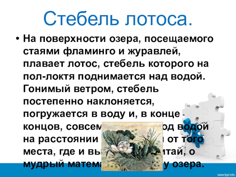 стебель которого на пол-локтя поднимается над водой. Гонимый ветром, стебель постепенно наклоняется, погружается в воду и, в конце концов, совсем исчезает под водой на расстоянии двух локтей от того места, где и вырос. Подсчитай, о мудрый математик, глубину озера.