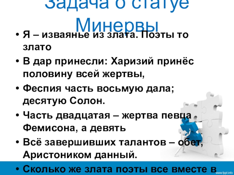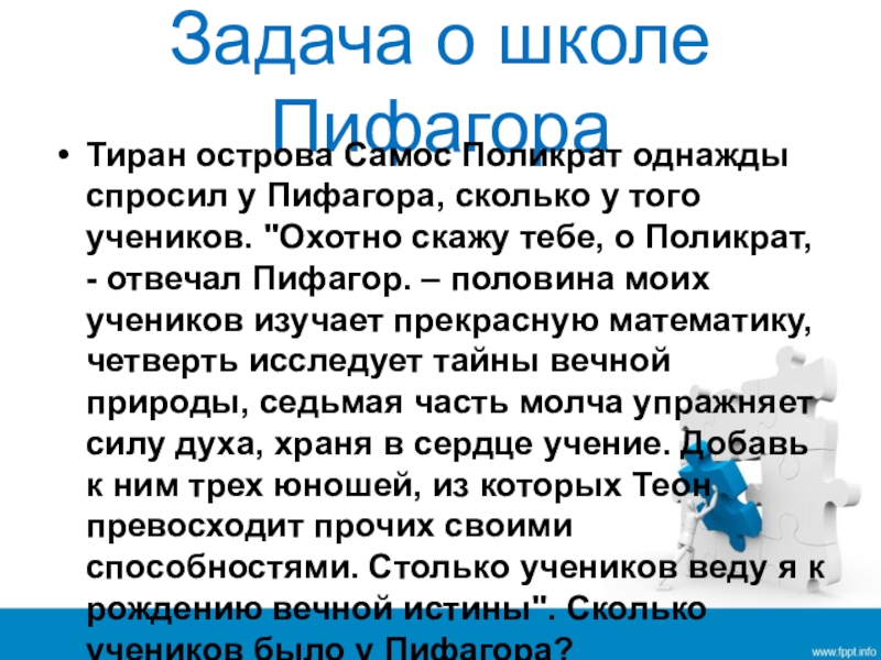 сколько у того учеников. "Охотно скажу тебе, о Поликрат, - отвечал Пифагор. – половина моих учеников изучает прекрасную математику, четверть исследует тайны вечной природы, седьмая часть молча упражняет силу духа, храня в сердце учение. Добавь к ним трех юношей, из которых Теон превосходит прочих своими способностями. Столько учеников веду я к рождению вечной истины". Сколько учеников было у Пифагора?