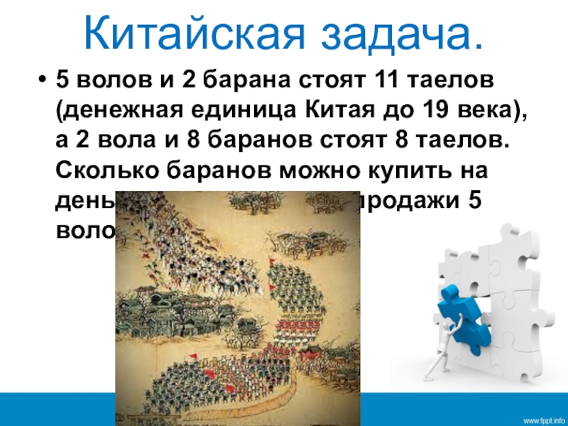 Китая до 19 века), а 2 вола и 8 баранов стоят 8 таелов. Сколько баранов можно купить на деньги, полученные от продажи 5 волов?