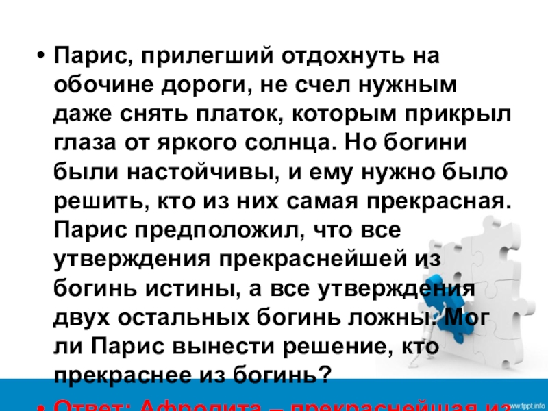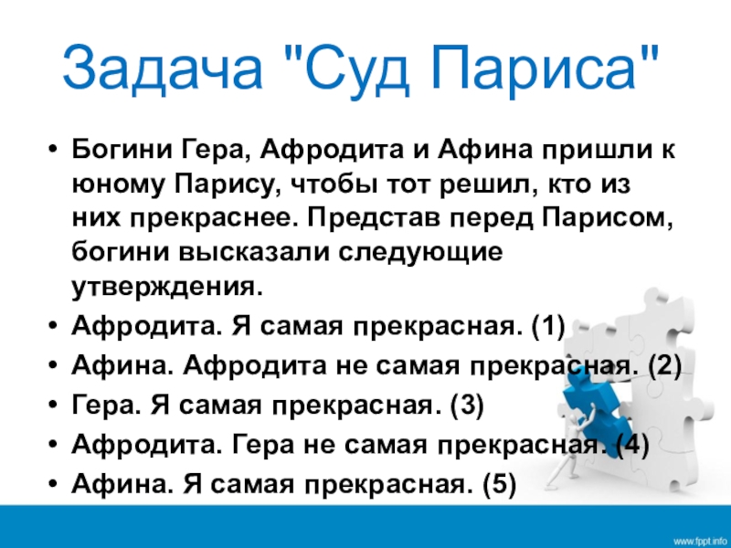 платок, которым прикрыл глаза от яркого солнца. Но богини были настойчивы, и ему нужно было решить, кто из них самая прекрасная. Парис предположил, что все утверждения прекраснейшей из богинь истины, а все утверждения двух остальных богинь ложны. Мог ли Парис вынести решение, кто прекраснее из богинь?