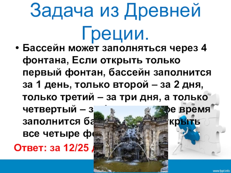 только первый фонтан, бассейн заполнится за 1 день, только второй – за 2 дня, только третий – за три дня, а только четвертый – за 4 дня. за какое время заполнится бассейн, если открыть все четыре фонтана?