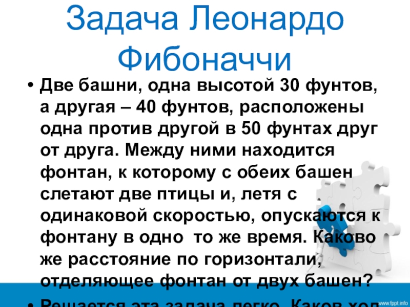 40 фунтов, расположены одна против другой в 50 фунтах друг от друга. Между ними находится фонтан, к которому с обеих башен слетают две птицы и, летя с одинаковой скоростью, опускаются к фонтану в одно то же время. Каково же расстояние по горизонтали, отделяющее фонтан от двух башен?