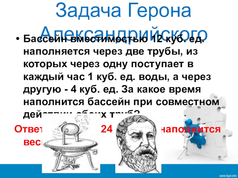 Бассейн вместимостью 12 куб. ед. наполняется через две трубы,
