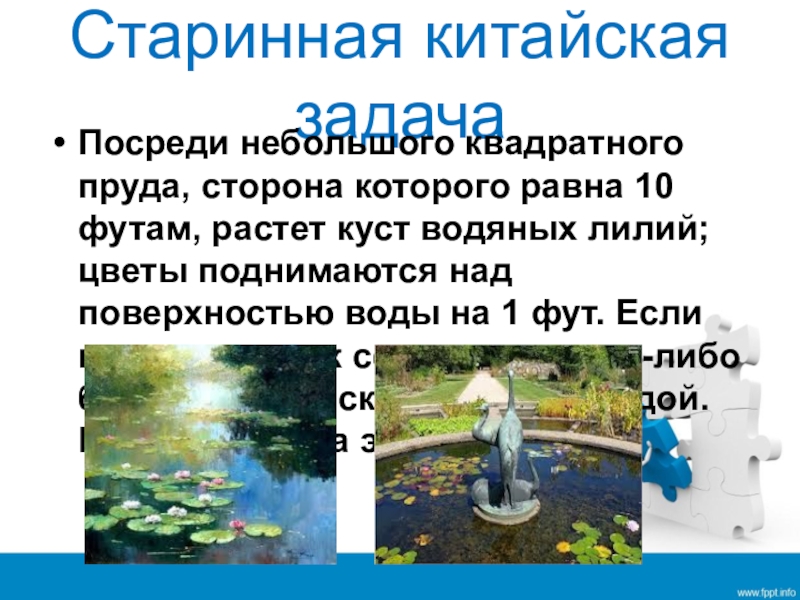 Посреди небольшого квадратного пруда, сторона которого равна 10 футам,