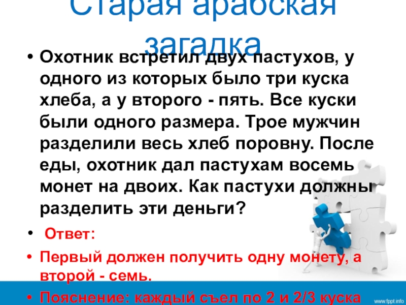 три куска хлеба, а у второго - пять. Все куски были одного размера. Трое мужчин разделили весь хлеб поровну. После еды, охотник дал пастухам восемь монет на двоих. Как пастухи должны разделить эти деньги?