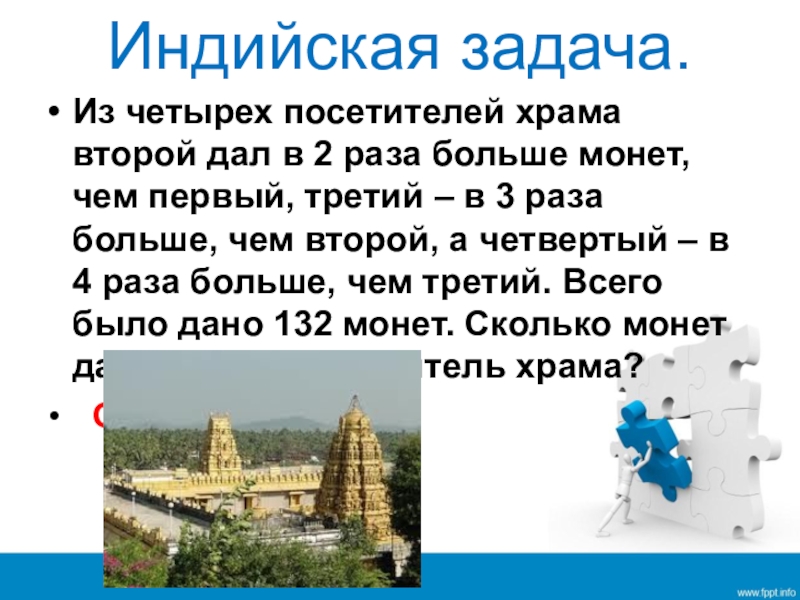 монет, чем первый, третий – в 3 раза больше, чем второй, а четвертый – в 4 раза больше, чем третий. Всего было дано 132 монет. Сколько монет дал первый посетитель храма?
