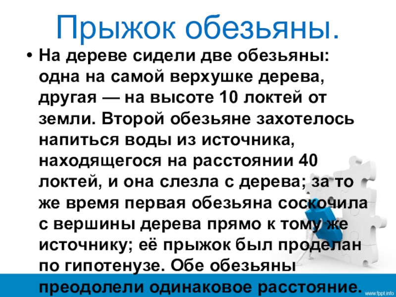 другая — на высоте 10 локтей от земли. Второй обезьяне захотелось напиться воды из источника, находящегося на расстоянии 40 локтей, и она слезла с дерева; за то же время первая обезьяна соскочила с вершины дерева прямо к тому же источнику; её прыжок был проделан по гипотенузе. Обе обезьяны преодолели одинаковое расстояние. Скажи быстро, мудрый человек, с какой высоты прыгнула обезьяна, и я увижу, как ты скор и точен в счёте.