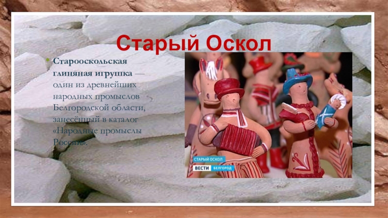 Старый Оскол Старооскольская глиняная игрушка — один из древнейших народных промыслов Белгородской области, занесённый в каталог «Народные