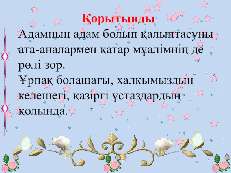 ҚорытындыАдамның адам болып қалыптасуны ата-аналармен қатар мұалімнің де рөлі зор.Ұрпақ болашағы, халқымыздың келешегі, қазіргі ұстаздардың