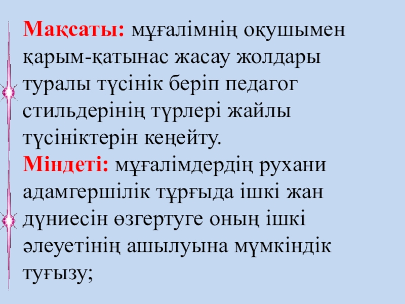 Слайд 2Мақсаты: мұғалімнің оқушымен қарым-қатынас жасау жолдары туралы түсінік беріп педагог стильдерінің