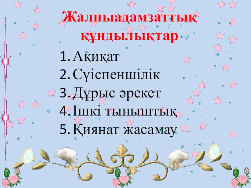 Жалпыадамзаттық құндылықтарАқиқатСүіспеншілікДұрыс әрекетІшкі тыныштықҚиянат жасамау