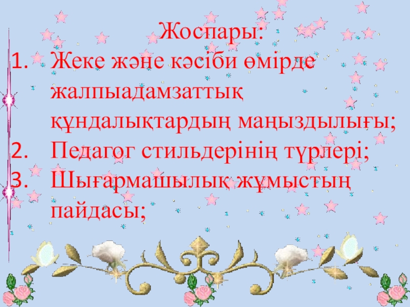 Жоспары: Жеке және кәсіби өмірде жалпыадамзаттық құндалықтардың маңыздылығы;Педагог стильдерінің түрлері;Шығармашылық жұмыстың пайдасы;