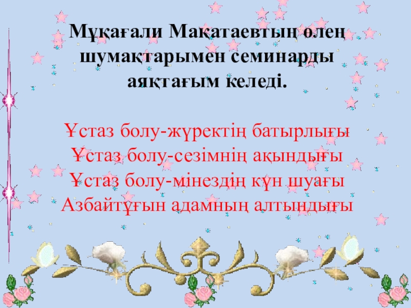 Мұқағали Мақатаевтың өлең шумақтарымен семинарды аяқтағым келеді.Ұстаз болу-жүректің батырлығыҰстаз болу-сезімнің ақындығыҰстаз болу-мінездің күн шуағыАзбайтұғын адамның алтындығы