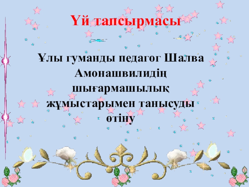 Үй тапсырмасыҰлы гуманды педагог Шалва Амонашвилидің шығармашылық жұмыстарымен танысуды өтіну