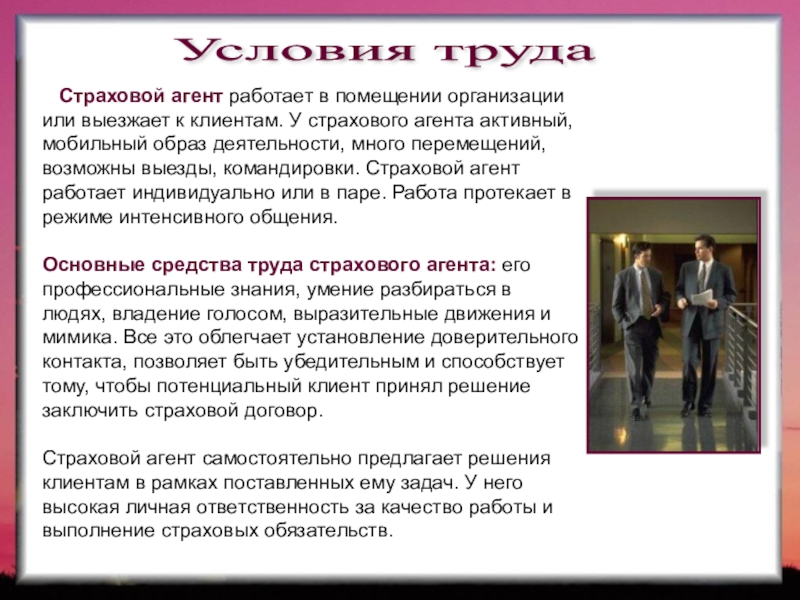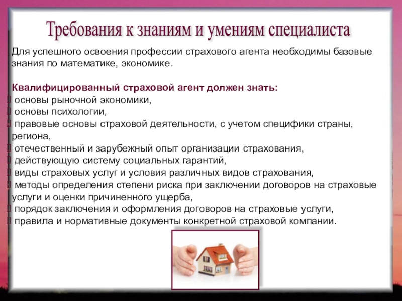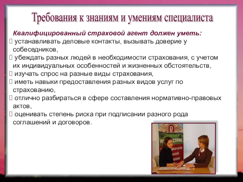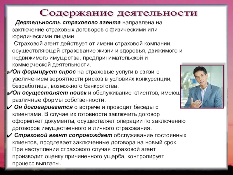 Страховой агент - лицо, уполномоченное страховой компанией для выполнения операций по страхованию физических или юридических лиц от возможного ущерба здоровью, жизни, имуществу. Профессия страхового агента требует от кандидата знаний не только в области страхования, но в первую очередь знания психологии людей.