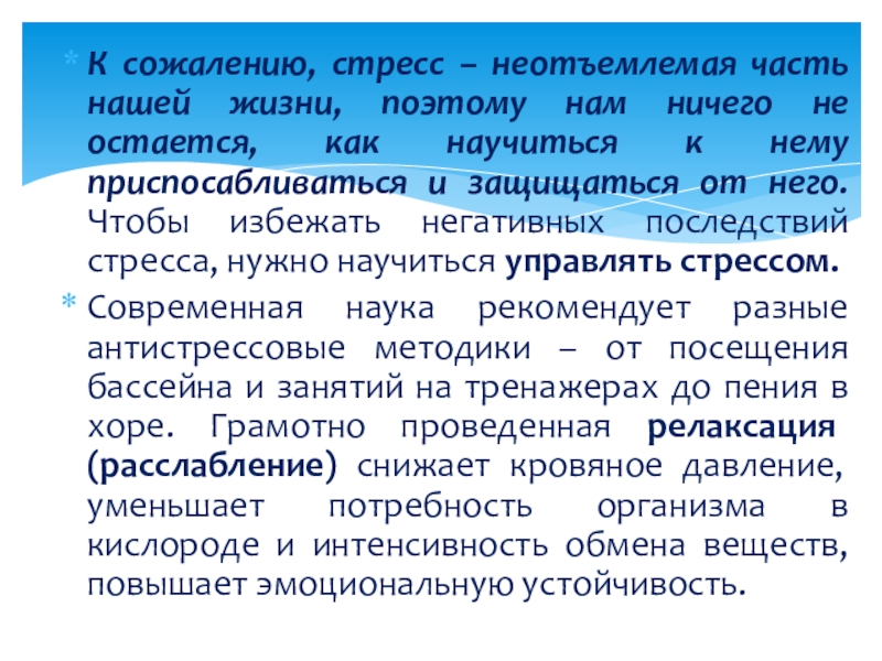 К сожалению, стресс – неотъемлемая часть нашей жизни, поэтому нам ничего не остается, как научиться к нему