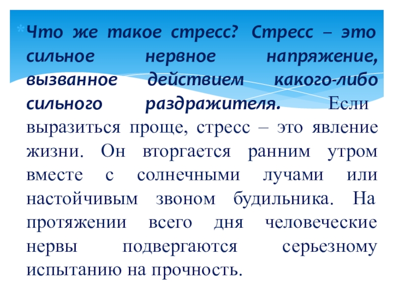 действием какого-либо сильного раздражителя.  Если выразиться проще, стресс – это явление жизни. Он вторгается ранним утром вместе с солнечными лучами или настойчивым звоном будильника. На протяжении всего дня человеческие нервы подвергаются серьезному испытанию на прочность.
