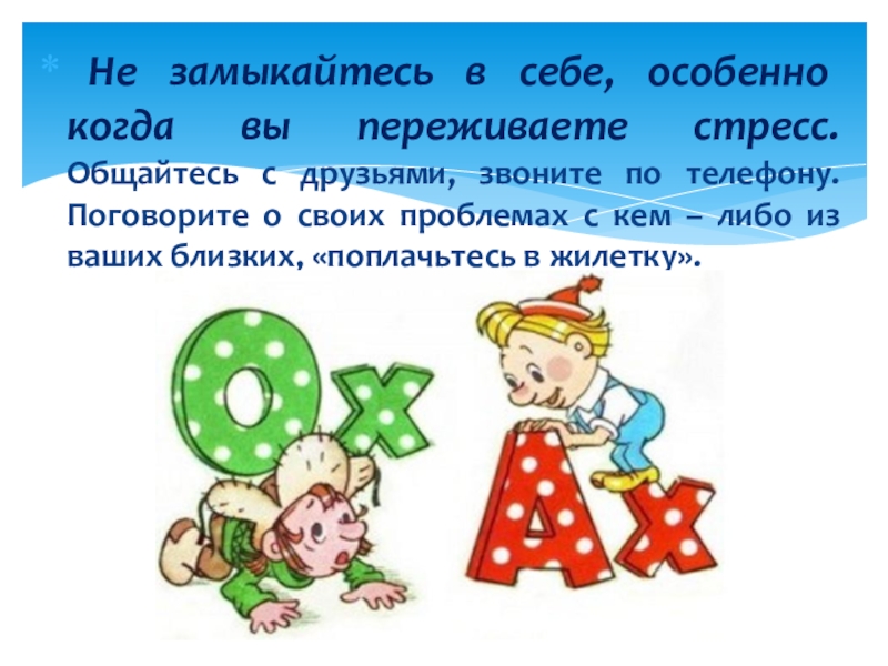 Слайд 9 Не замыкайтесь в себе, особенно когда вы переживаете стресс. Общайтесь