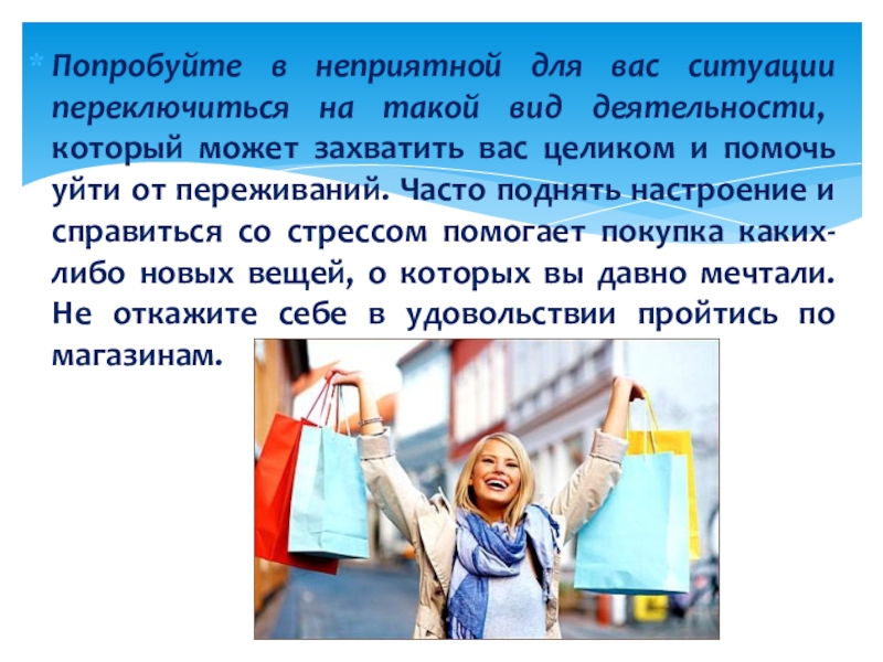 Слайд 12Попробуйте в неприятной для вас ситуации переключиться на такой вид деятельности,
