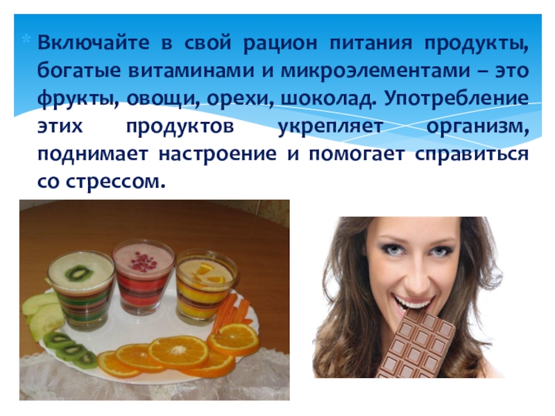 Включайте в свой рацион питания продукты, богатые витаминами и микроэлементами – это фрукты, овощи, орехи, шоколад. Употребление