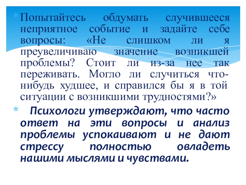 Попытайтесь обдумать случившееся неприятное событие и задайте себе вопросы: «Не слишком ли я преувеличиваю значение возникшей проблемы?